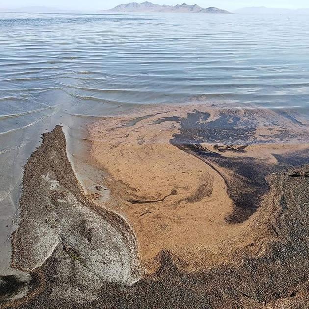 Photos from the Great Salt Lake State Park and Marina show what looks like a swirling, brown slick on the water at the marina west of Salt Lake City.
