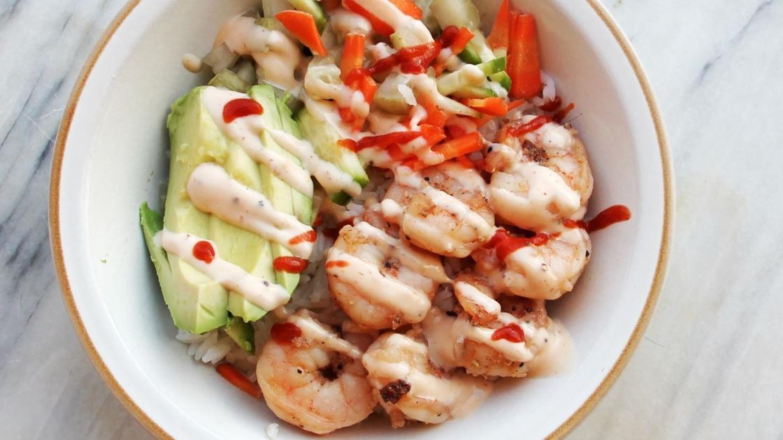 4. To assemble sushi bowls, just add rice to your bowl then top with shrimp, chopped veggies, and sriracha mayo.